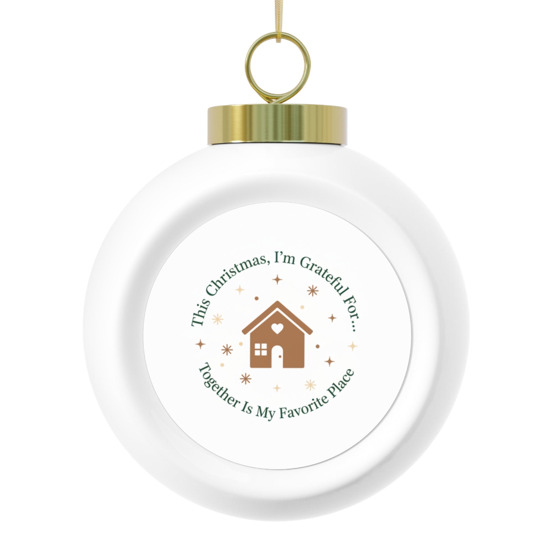 Celebrate togetherness with this 3" glossy ceramic Christmas ball ornament featuring the heartfelt phrase Together Is My Favorite Place in a warm, vintage style. The centered design sits on an aluminum insert and hangs from a gold ribbon for an elegant finish. Perfect as a sentimental gift or a cozy addition to your holiday tree.