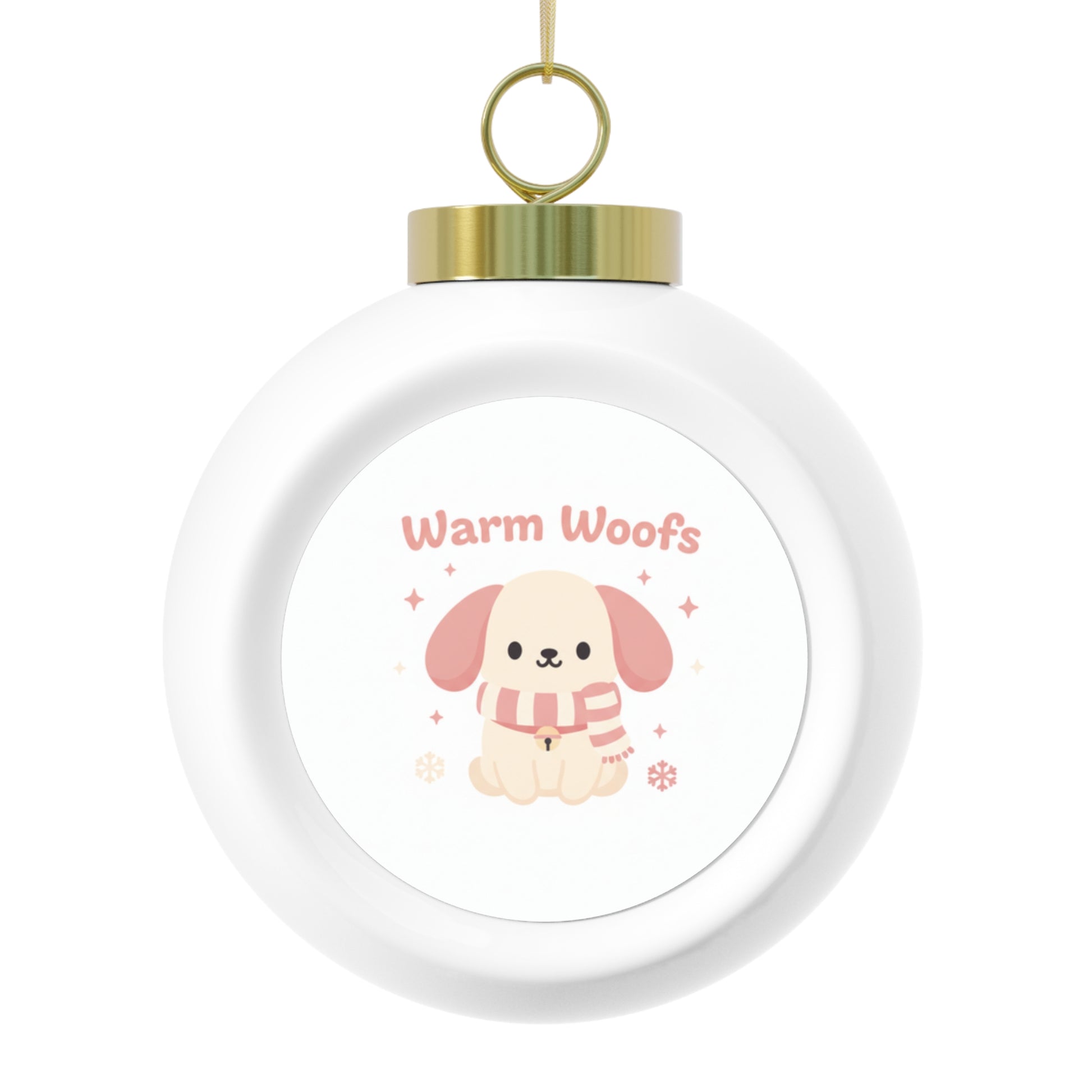 A glossy 3" ceramic Christmas ball ornament featuring the "Warm Woofs" dog-themed design. Includes a gold ribbon hanger and a vintage-style back accent for classic holiday charm. Perfect as a keepsake or gift for dog lovers to display on the tree year after year.