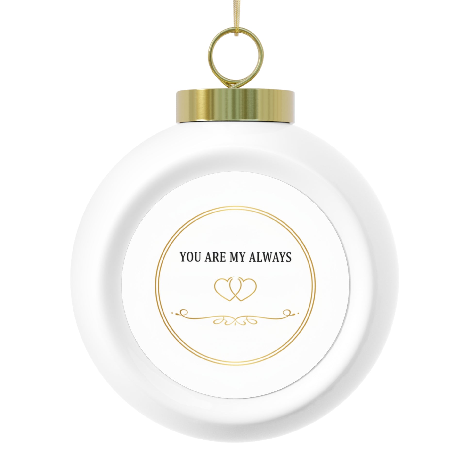 A glossy ceramic Christmas ball ornament featuring the heartfelt phrase You Are My Always in a vintage-inspired typographic style. Perfect as a romantic keepsake or stocking stuffer to celebrate a loved one. Includes a gold ribbon for easy hanging and a tree or bell decoration on the back. Compact 3" size adds a personal, elegant touch to any holiday tree.