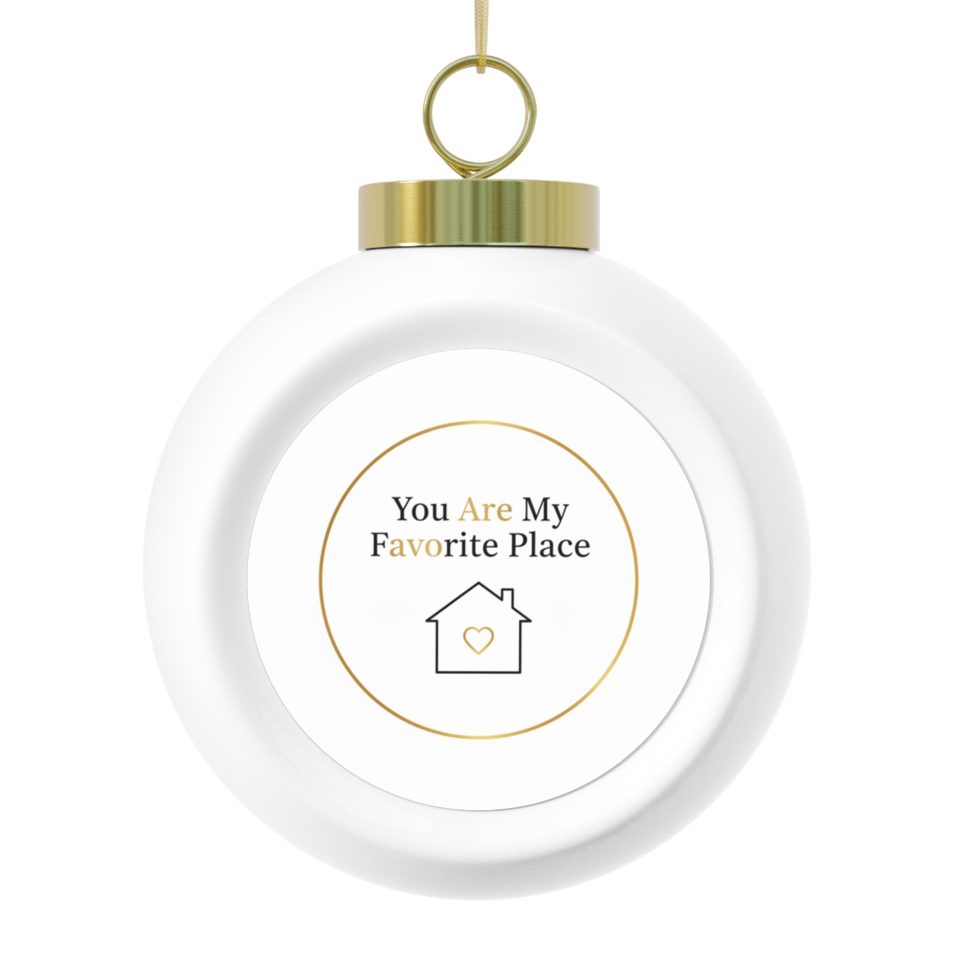 A glossy ceramic 3" ornament featuring the heartfelt phrase You Are My Favorite Place in warm, vintage-style typography. It comes ready to hang with a gold ribbon and a classic tree or bell decoration on the back. A thoughtful, personal holiday accent that makes a lovely gift for partners, family, or close friends.