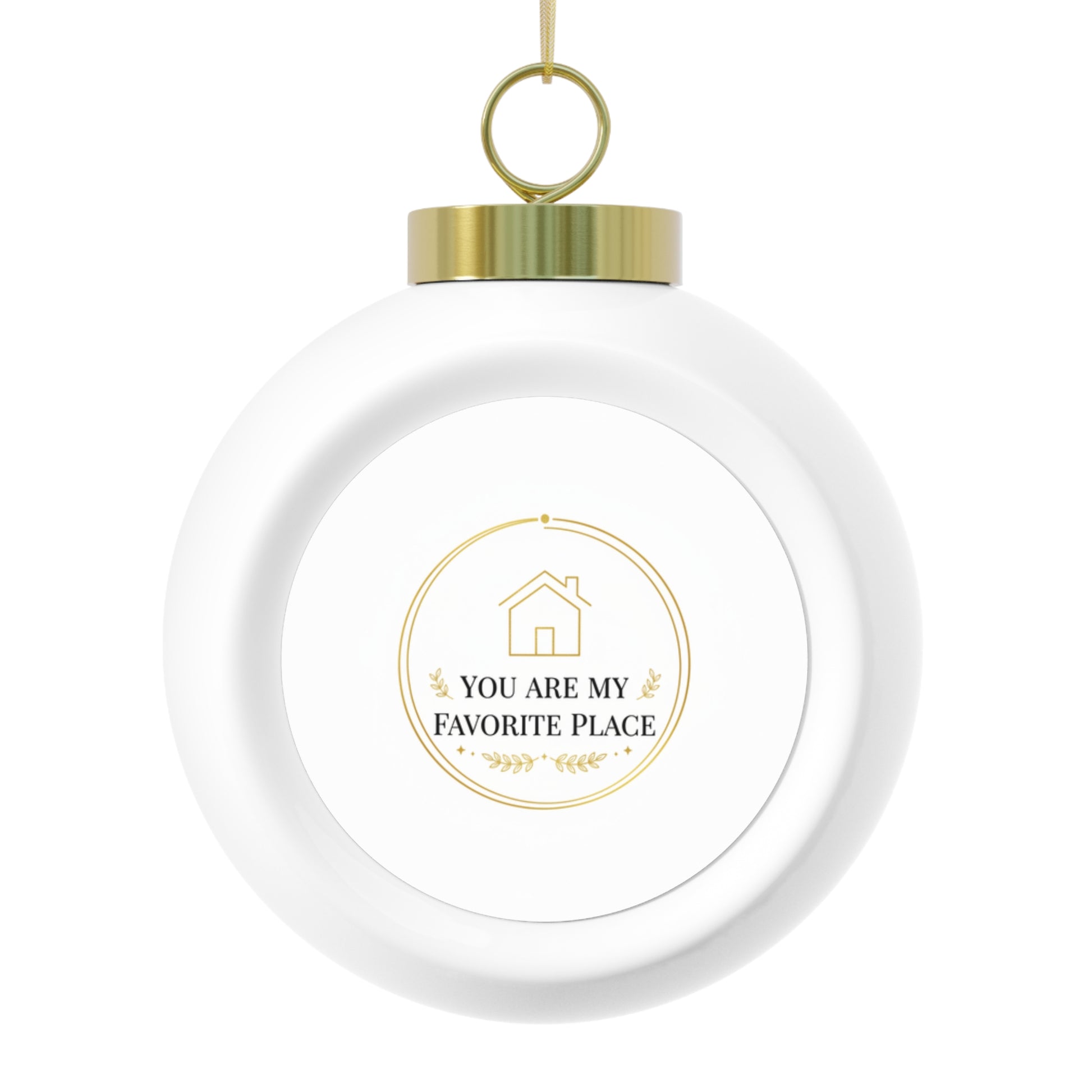 A glossy ceramic Christmas ball ornament featuring the heartfelt phrase You Are My Favorite Place. The vintage-inspired, centered design sits on a polished insert for an elegant holiday look. Includes a gold ribbon for hanging and makes a meaningful keepsake or gift for a partner or family member.