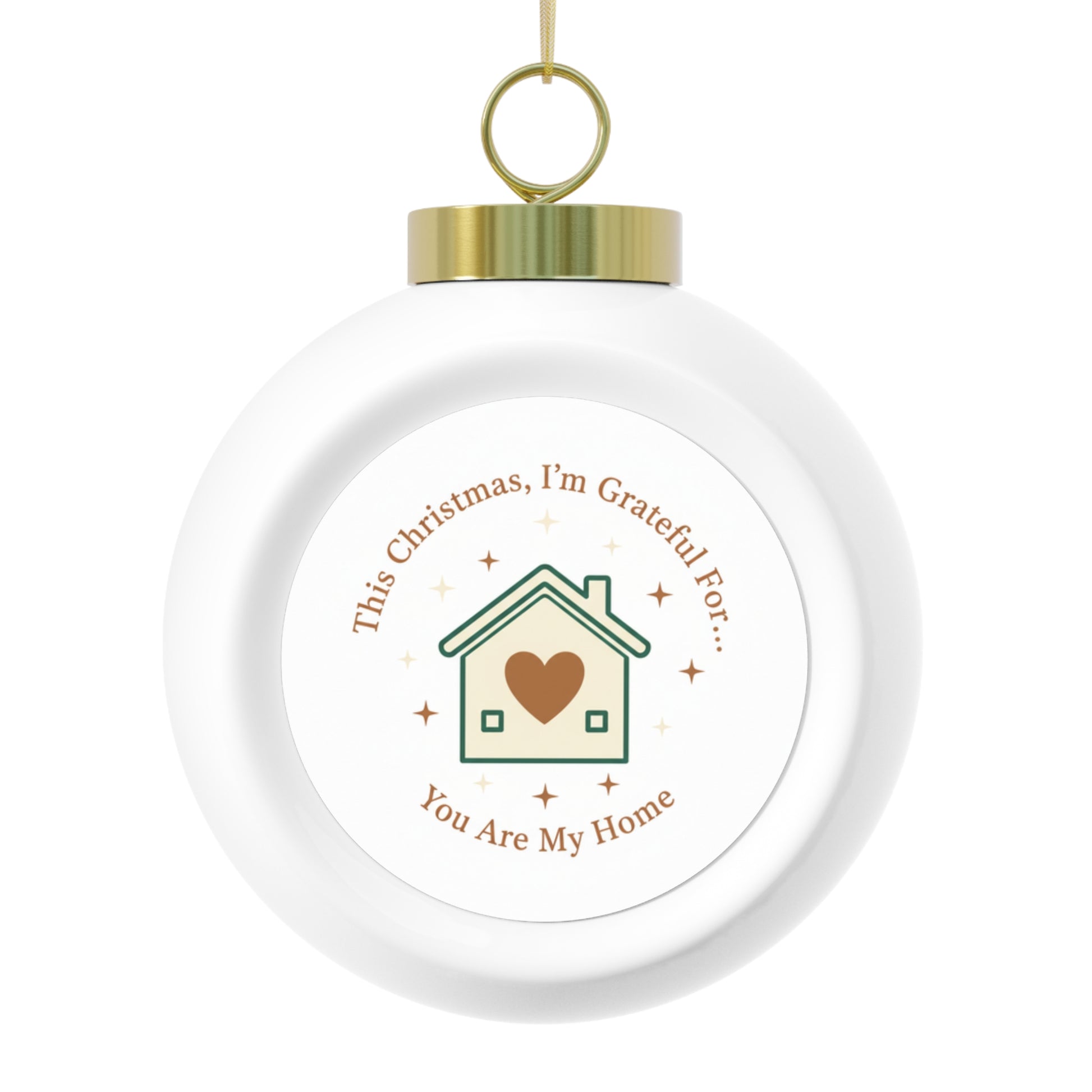 A glossy ceramic Christmas ball ornament featuring the heartfelt phrase You Are My Home. The 3" ornament hangs from a gold ribbon and adds a warm, sentimental touch to any tree. Perfect as a romantic keepsake or thoughtful holiday gift for partners, family, or new homeowners.