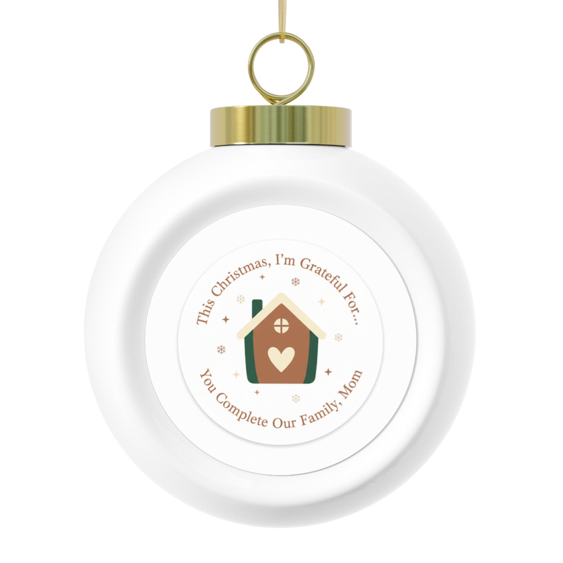 A glossy 3" ceramic Christmas ornament featuring the heartfelt message You Complete Our Family, Mom. Includes a gold ribbon for easy hanging and a vintage-style back detail. A thoughtful personalized keepsake to celebrate Mom and family holiday traditions. Perfect for gifting or adding a sentimental touch to the tree.