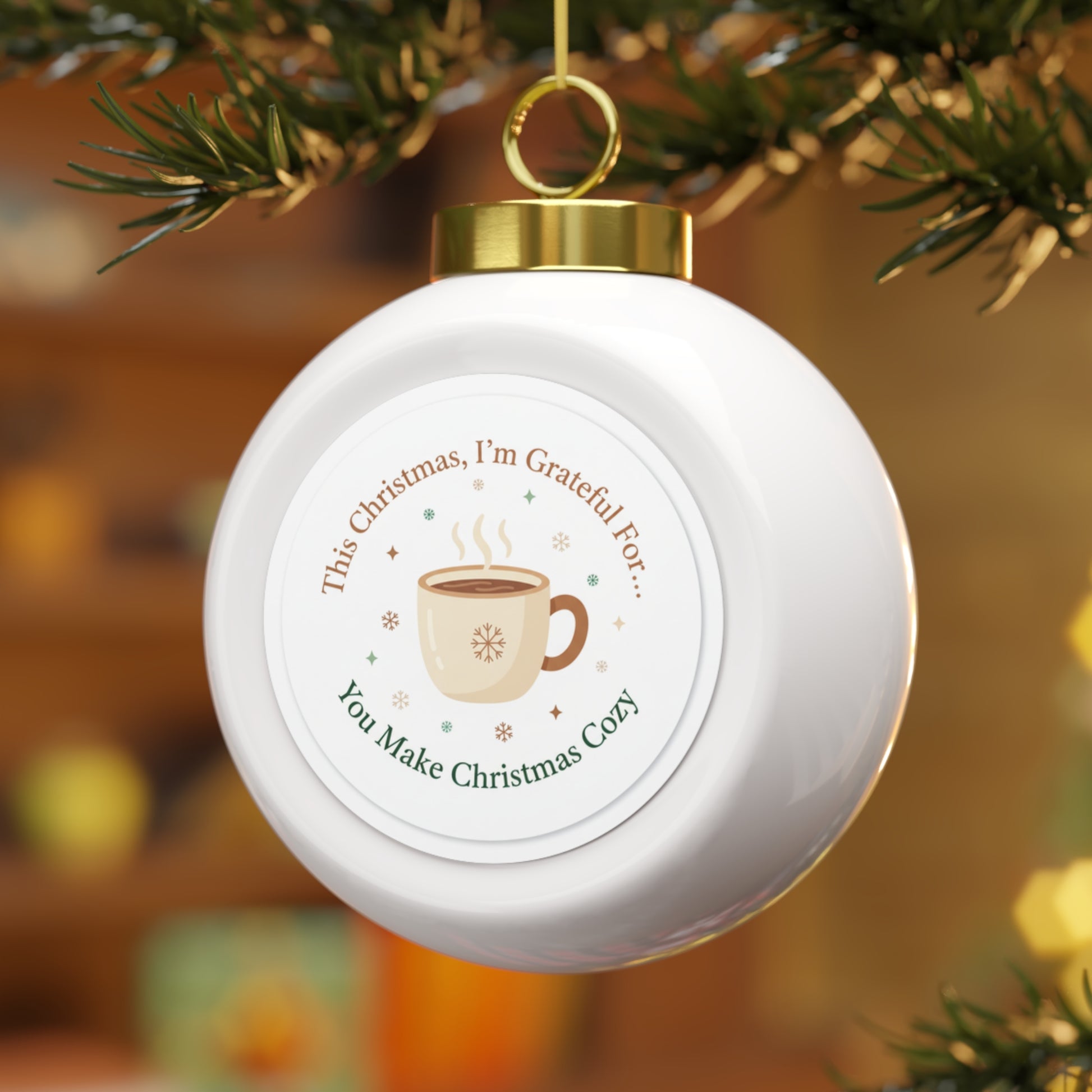 Glossy 3" ceramic Christmas ball ornament featuring the warm lettering 'You Make Christmas Cozy' in a vintage-inspired style. Comes with a gold ribbon for hanging and a decorative tree or bell on the back. A cozy, personalized accent perfect for gifting or adding a heartfelt touch to your holiday tree.