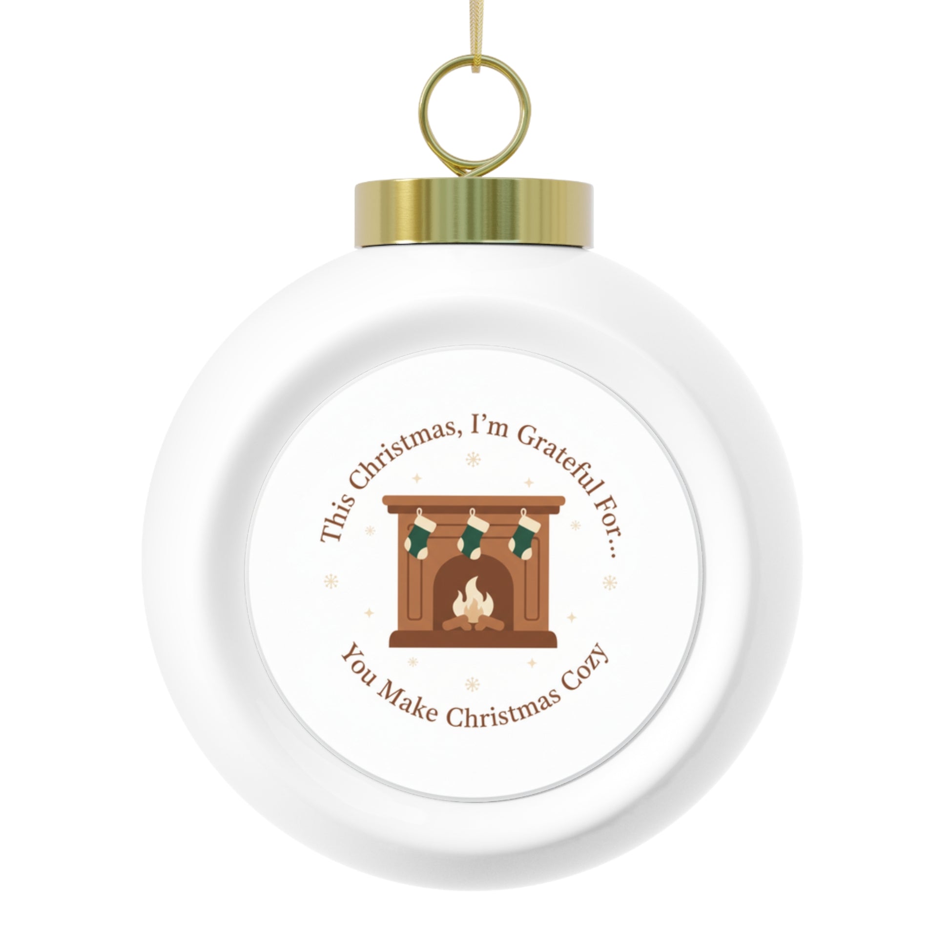 Glossy 3" ceramic Christmas ball ornament featuring the warm phrase You Make Christmas Cozy in a vintage-inspired style. Comes ready to hang with a gold ribbon and a decorative tree or bell detail on the back. A charming, personal accent perfect for gifting or adding a cozy touch to your holiday tree.