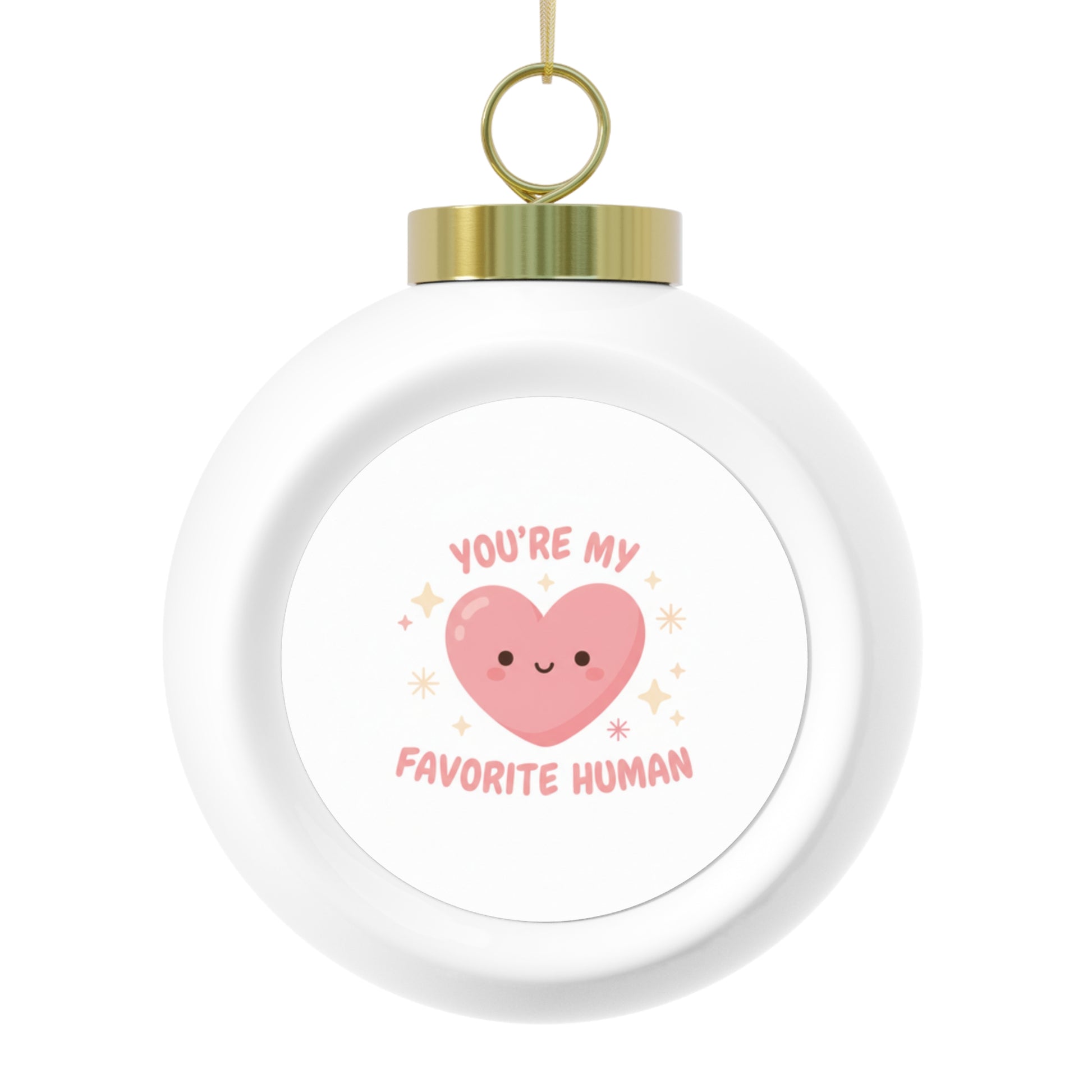 A sweet 3" ceramic Christmas ornament featuring the phrase You're My Favorite Human in a warm, playful style. Glossy finish and included gold ribbon make it ready to hang on the tree or gift to someone special. Vintage-style back detail and a durable aluminum insert ensure lasting color and shine.