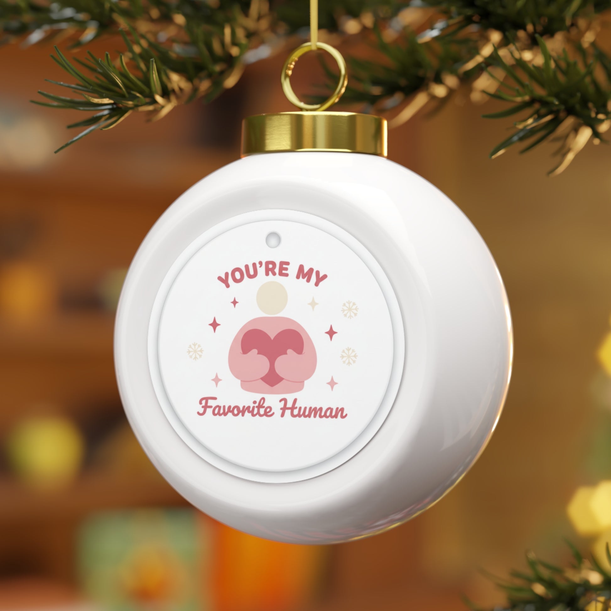 This 3" glossy ceramic Christmas ball ornament showcases the sweet phrase You're My Favorite Human on a vintage-style aluminum insert. It comes ready to hang with a gold ribbon and a subtle tree or bell detail on the back. A charming, small keepsake perfect for gifting loved ones or adding a personal touch to your holiday decor.