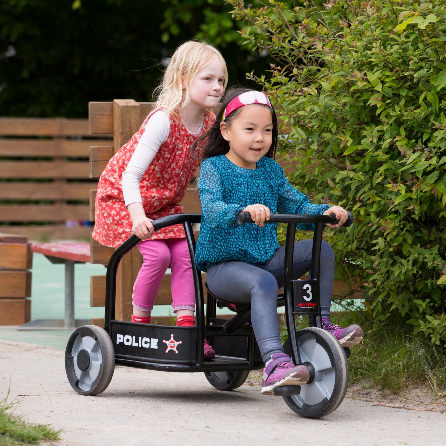 All bad guys better watch out. The police are here. This cool trike quickly becomes the natural center for social activities on the playground. Built-in steering limiter. Attractive new design with no sharp edges. Strong heavy duty tubes ensure maximum strength. Pedals and spokeless wheels made of polypropylene with solid rubber.
