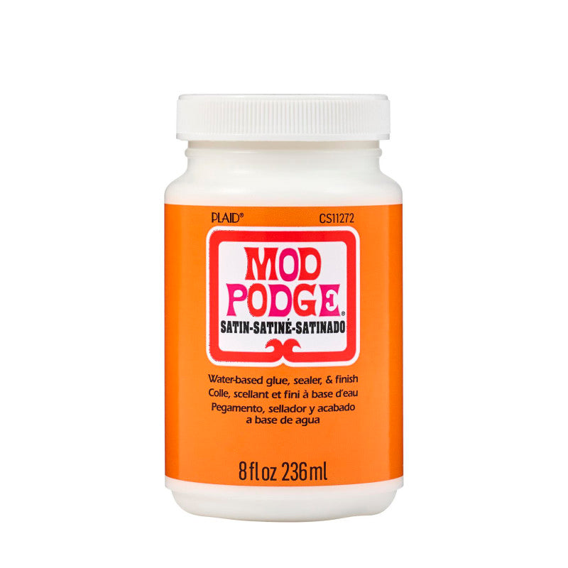 For over 55 years Mod Podge has been America's favorite glue, sealer, and finish. Mod Podge Satin is quick-drying and dries clear, leaving a smooth, satin finish. Preserve the beauty of your decoupage paper projects and more with this multi-purpose, all-in-one sealant, glue, and finish. Use this decoupage glue to create decoupage tissue paper projects as well as projects using wood, fabric, plastic, and canvas! This handy decoupage glue comes in a variety of other finishes such as gloss, matte, glitter, outdoor, dishwasher safe, and many other unique formulas for every project. Let your creativity come alive with the limitless possibilities of Mod Podge Satin. Includes one 8 oz. bottle.