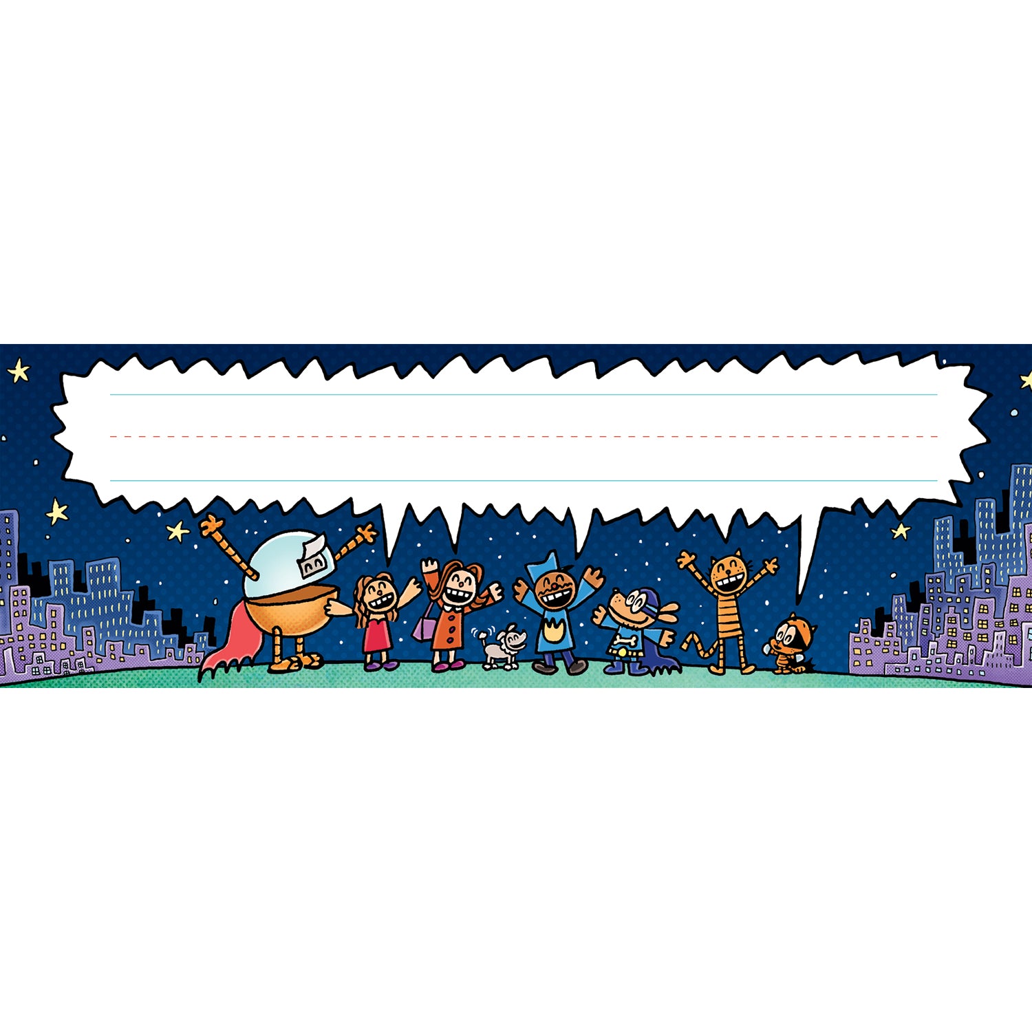 Brighten up students’ desks with these delightful name plates featuring Dog Man, Li’l Petey (a.k.a. Cat Kid), Petey, Chief, and other favorite characters from Dav Pilkey’s blockbuster Dog Man series. Name plates measure 12" x 4". Each pack includes 36 name plates.