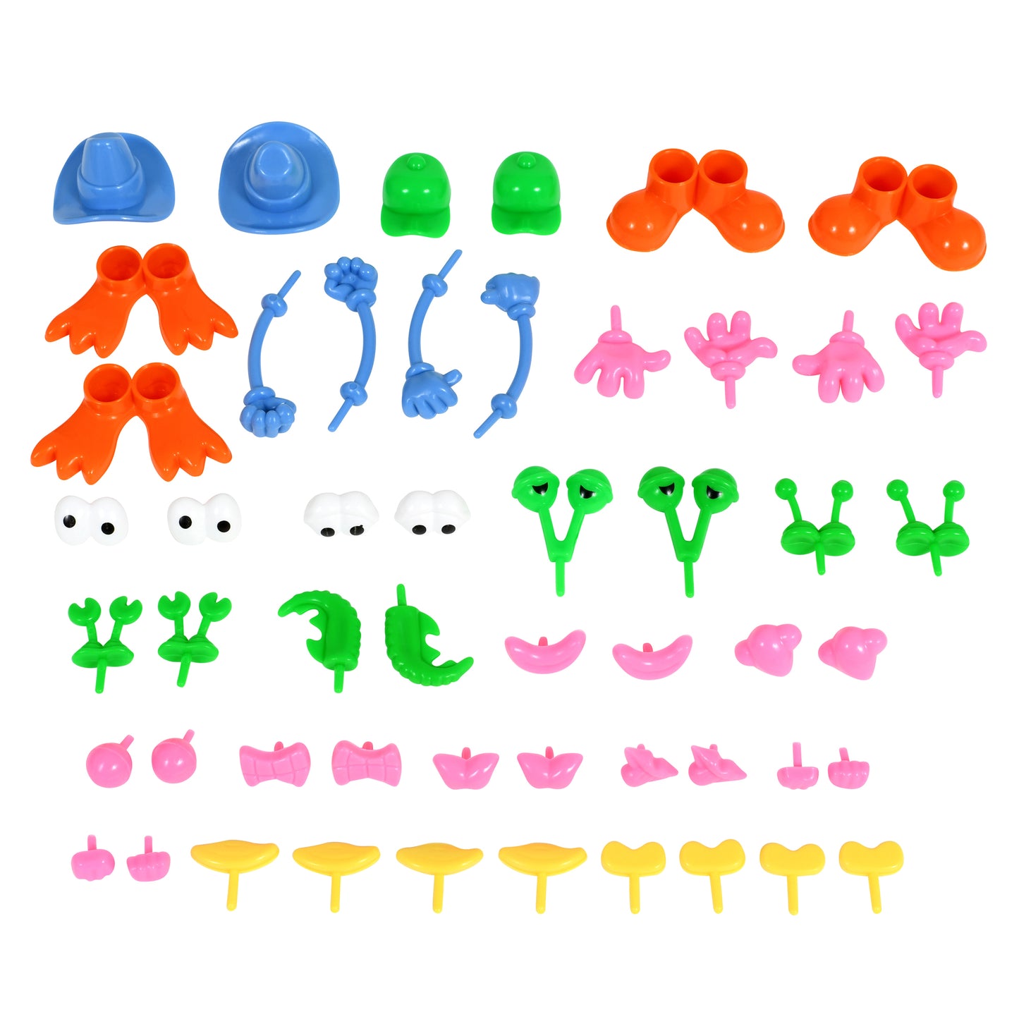 Bring your dough creations to life! Each set comes with 52 body parts and accessories in 21 different shapes. They're versatile and feature arms, feet, eyes and much more for decorating all kinds of objects. Put them on desserts, fruits, vegetables, crafts, sculptures and more. Children can add personality and create narratives as they make new characters. Dough characters help children explore emotions, role play, communication and social-emotional learning. Children love to create whacky characters and act out stories. Develop imagination, creative expression, hand-eye coordination and fine motor skills as children insert different accessories into dough. These accessories are made of durable plastic, so children can use them repeatedly. The accessories quickly come clean with soap and warm water. Includes 2 types of hands, 3 types of eyes, 2 types of feet, 3 types of mouth, 2 types of nose, 2 types of ears, eyebrows, a mustache, 2 hats and 3 miscellaneous appendages. || For ages 3+. Size of pointy feet: 2.7"L. Size of eyebrow: 1.7"L. Dough not included. Colors may vary. Sold as 3 sets for a total of 156 pieces.