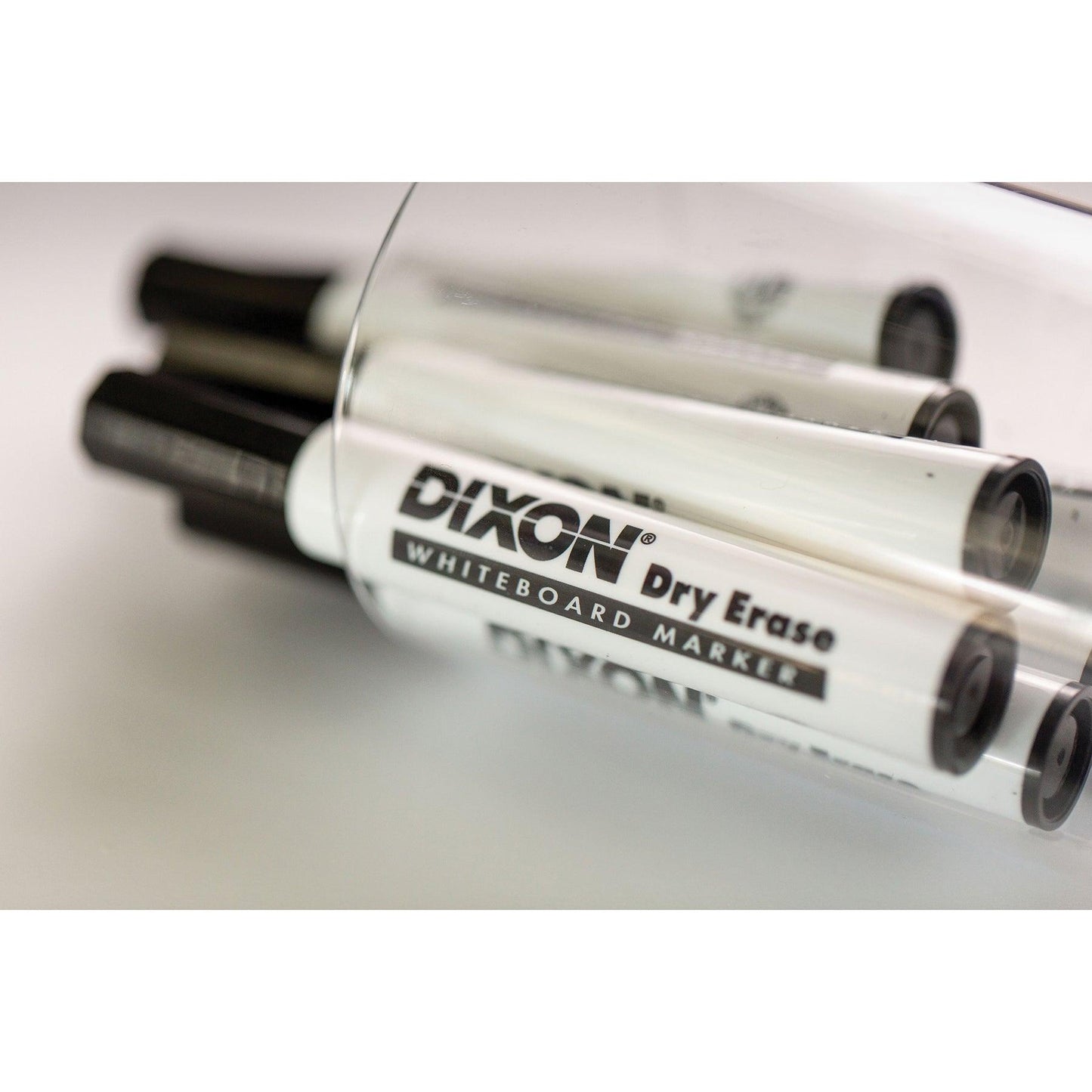 Dixon dry erase markers write on all types of whiteboards and non-porous surfaces, including glass. Opaque inks flow smoothly and evenly on the surface. They wipe away cleanly and easily with a cloth or eraser. Wedge tips provide a variety of strokes. Vented caps conform to small parts specifications. AP certified, non-toxic. Each pack includes 12 markers.