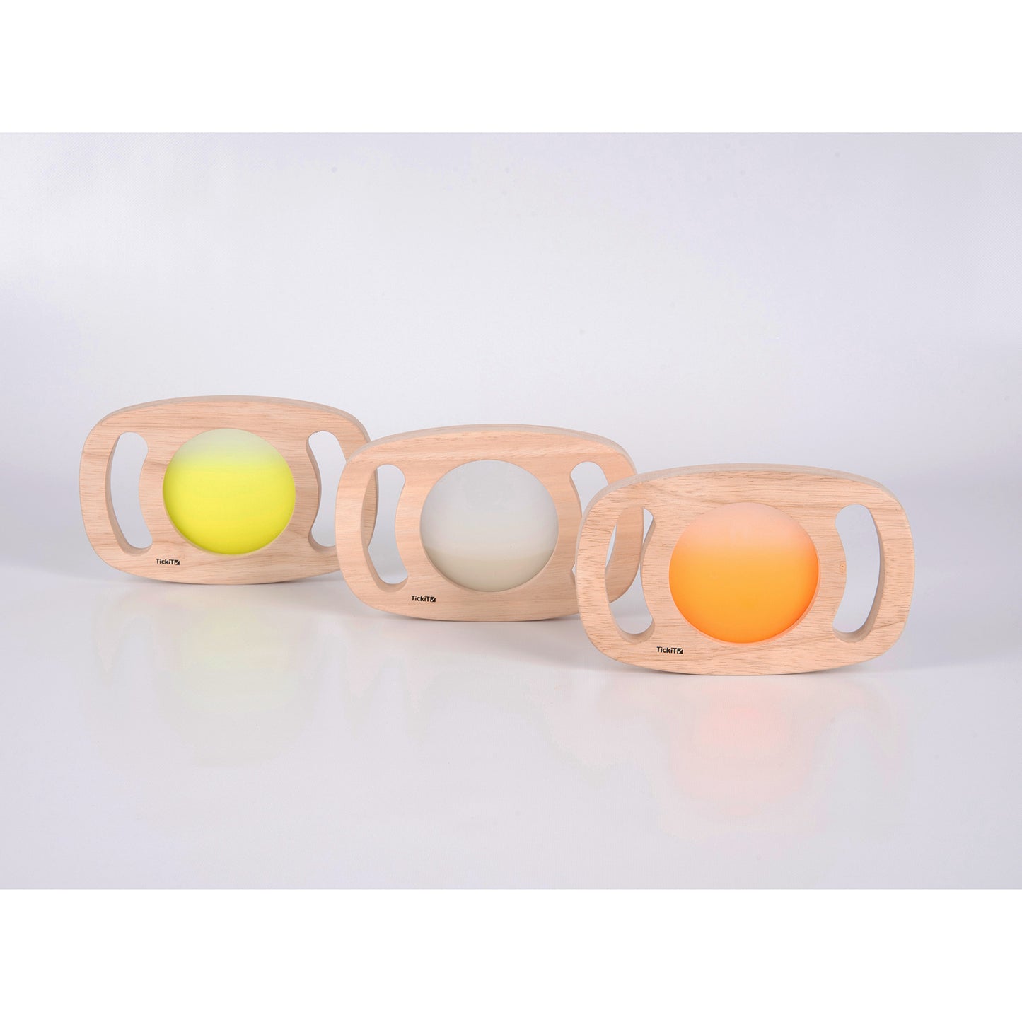 This glow panel set comes with three glow panels in three different colors. Stimulate the senses with blue, green and yellow! Watch the liquid flow and swirl. Children will love the vibrant colors and smooth surfaces. Small hands will have no problem gripping the large handholds with rounded edges. Just 15 minutes of sunlight will activate these panels for about 6 hours. These durable rubberwood panels are designed to last for years without scratching, leaking or breaking. For ages 12m+. Size: 7.25"L x 4.5"W. Size of lens: 3.2" dia.