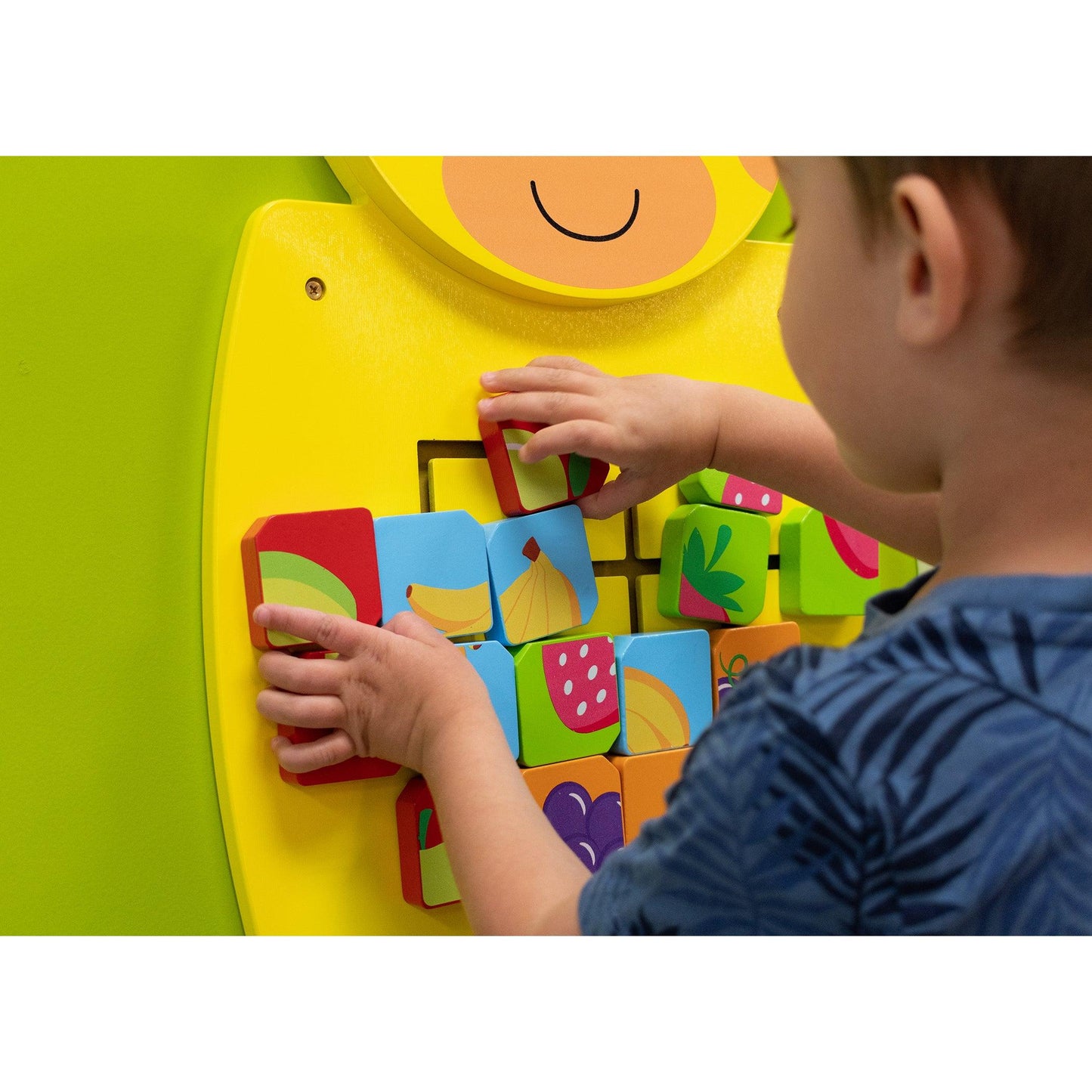 The Giraffe Activity Wall Panel helps develop motor, collaborative play, communication, language and early math skills as children match the fruit puzzle blocks. The wooden panel contains 16 sliding puzzle blocks for children to form images of bananas, grapes, a strawberry and an apple. Use the fruit puzzles to inspire conversations about colors and nutrition. This wall toy is easy to assemble and provides a clutter-free play area. It's perfect decor for daycare centers, waiting rooms, classrooms and more! The activity panel includes fixing holes and screws for attachment. For ages 18m+. Size of panel: 22"L x 15"W.