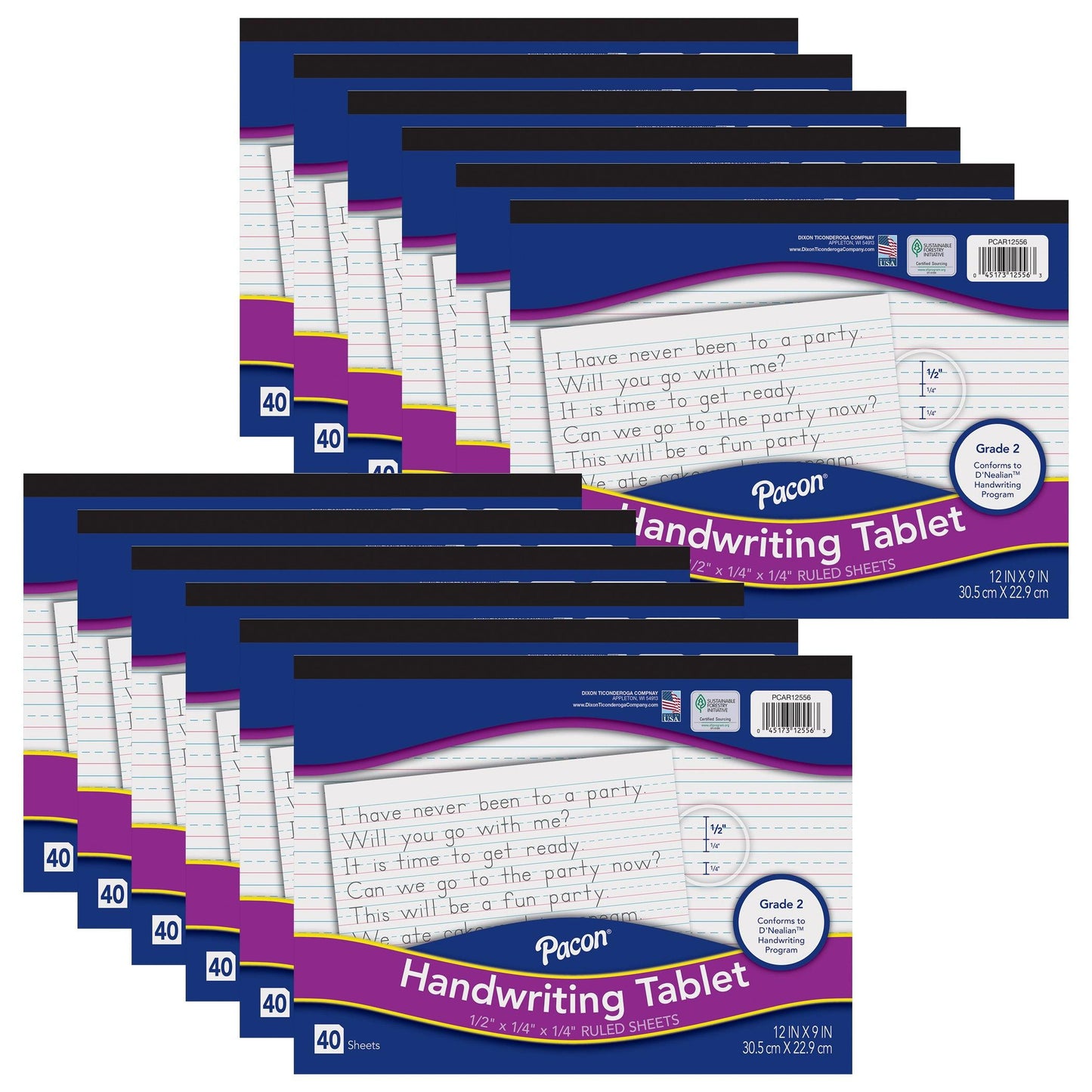 Our Handwriting Tablet is great for tracking students' handwriting progress over time, and helps build a solid foundation for students to write legibly and communicate effectively through writing. Paper is 1/2" ruled on both sides with solid blue headlines, 1/4" dotted blue midlines, solid red baselines and 1/4" skip space. Recyclable. Each tablet measures 12" x 9" and includes 40 sheets. Sold as a pack of 12 tablets.