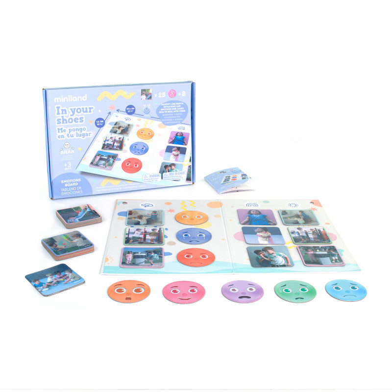 In your shoes is a complete game designed to work on empathy and cooperation from childhood. Through an emotions board and 25 illustrative images, children will analyze situations of pre-bullying at school, learning to identify conflicts related to bullying, understand their own emotions and explore tools to transform those experiences. With a practical and dynamic approach, this game encourages dialogue, reflection and the development of emotional skills, essential to create a more inclusive and respectful environment. The 8 faces included allow little ones to express and connect with emotions visually, facilitating their learning. Contents: board, 25 images, 8 faces, explanatory brochure and complete guide. Recommended for ages 3 and up, it is an ideal educational tool for families, teachers and therapists who want to teach values of empathy and cooperation from an early age.