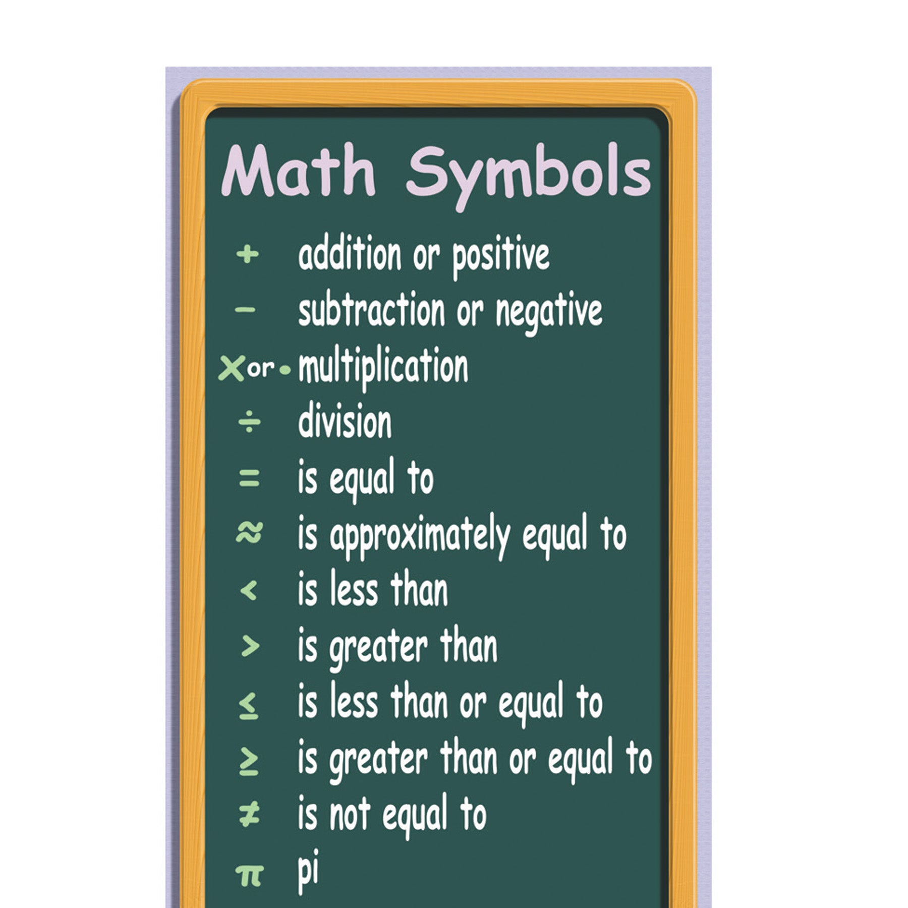 This giant chalkboard displays 25 important math symbols and their meanings. The accompanying teacher’s guide contains a variety of extensions activities students are sure to enjoy. Poster measures 22" x 68".