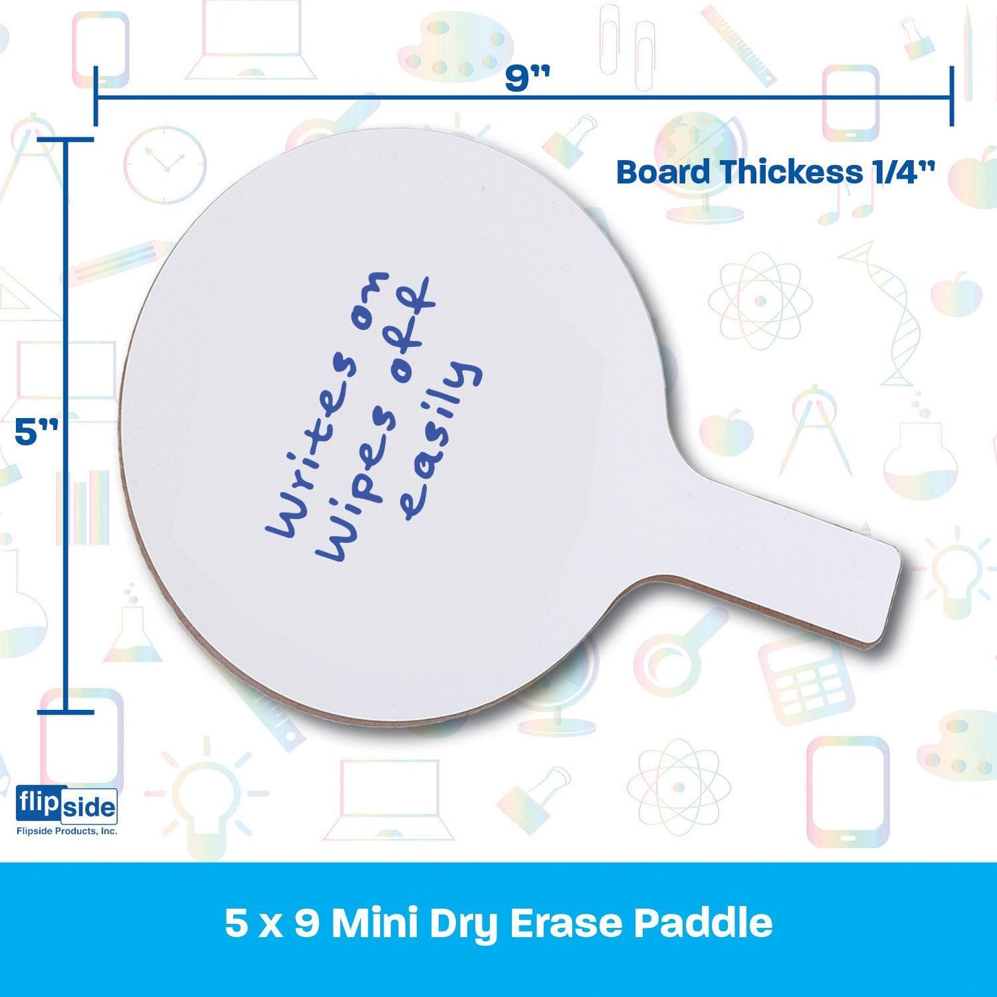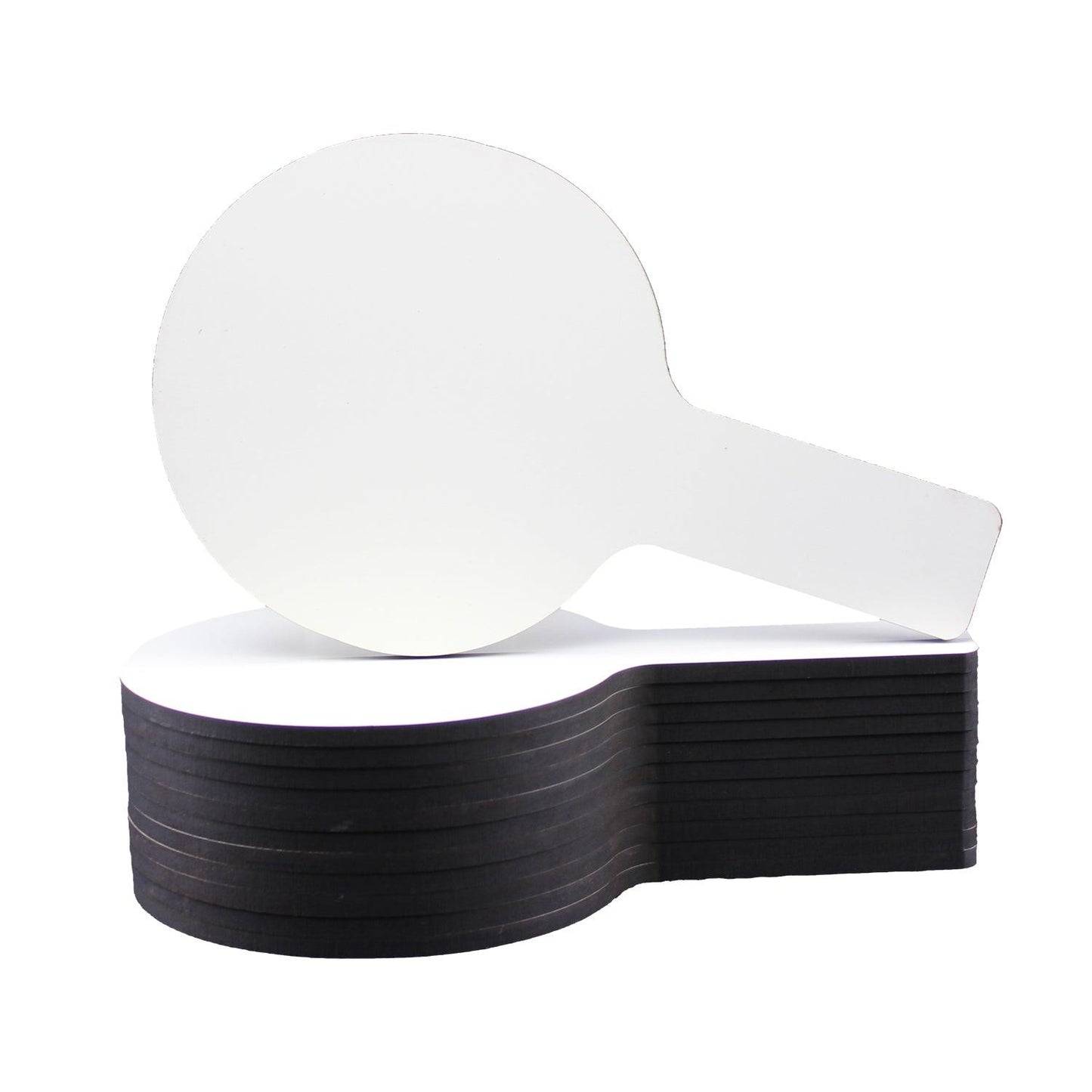 Make everything more fun with dry erase paddles. Quick and quiet whole class participation made easy with Dry Erase Mini Answer Paddles. Great for review sessions, surveys, assessments, and more! Non-ghosting dry erase surface with a rounded shape, an easy grip handle and smooth edges. Hardboard backing is warp and chip resistant. Single- sided, measures 5" x 9". Pack of 12 paddles.