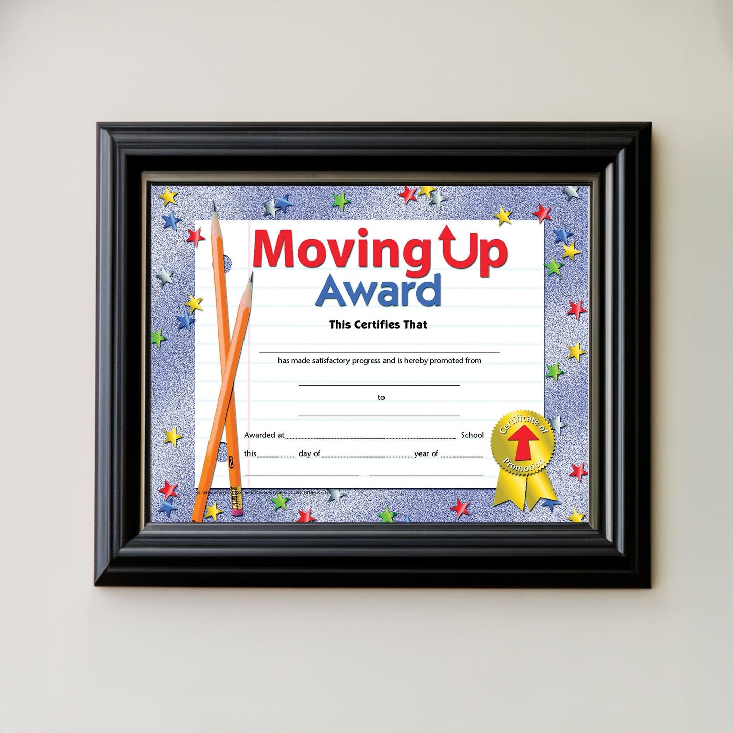 Certificate Reads: Moving Up Award This Certifies That _____ has made satisfactory progress and is hereby promoted from _____ to _____ Awarded at _____ School this _____ day of _____ year of _____. These certificates can personalized by handwriting them in or printing them. Downloadable template available online.