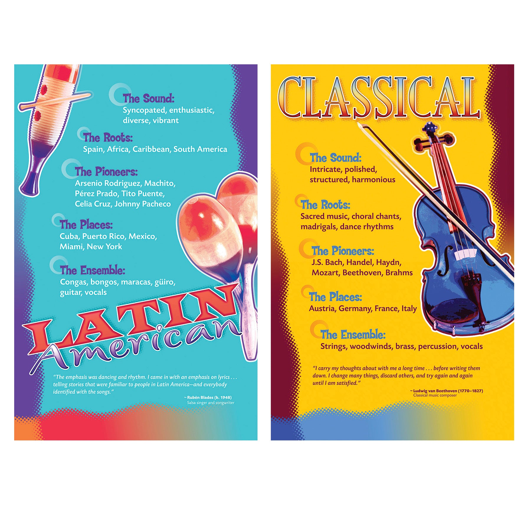 Set the stage for a fresh, new approach to music education with the Music Genres bulletin board. From the impromptu variations of jazz to the structured harmonies of classical music, this bulletin board acquaints students with eight top music genres, highlighting the foundations and history, as well as the signature sounds and instruments of each genre. Includes eight 11" x 17" (27.9 x 43.2 cm) posters and a two-page teacher guide.