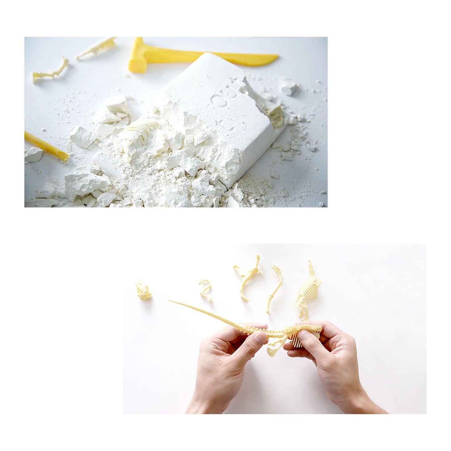First, students use the tools included in the box to carefully chip away at the block of plaster to discover what is hidden beneath the surface. Using the tools provided, they will discover the dinosaur fossils, then combine each fossil to create a complete skeleton.