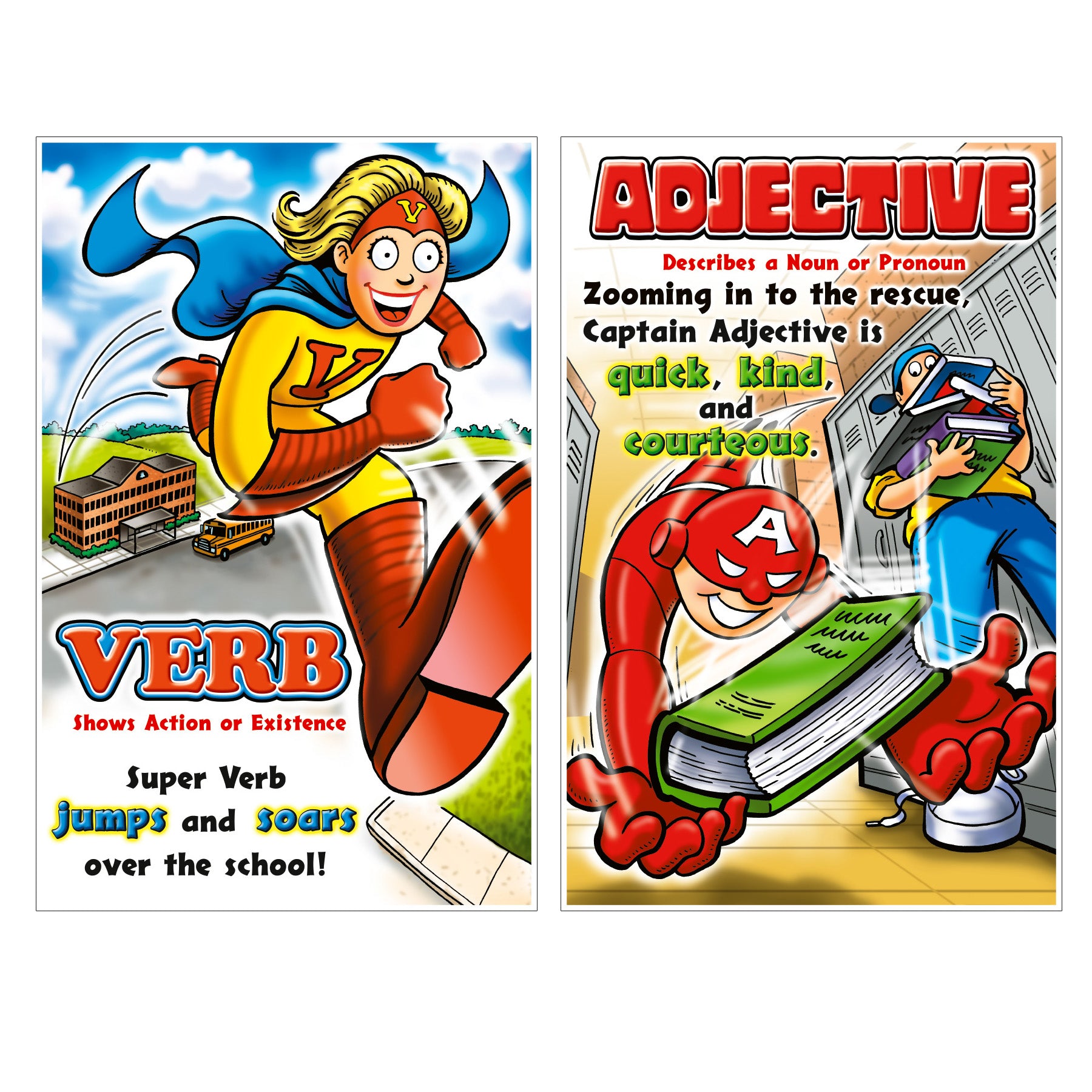 These superheroes make learning parts of speech dramatic and exciting! Each colorful 11" x 17" (27.9 x 43.2 cm) poster features a clear definition and an example. Includes a four-page teacher guide with reproducibles. 8 pieces.