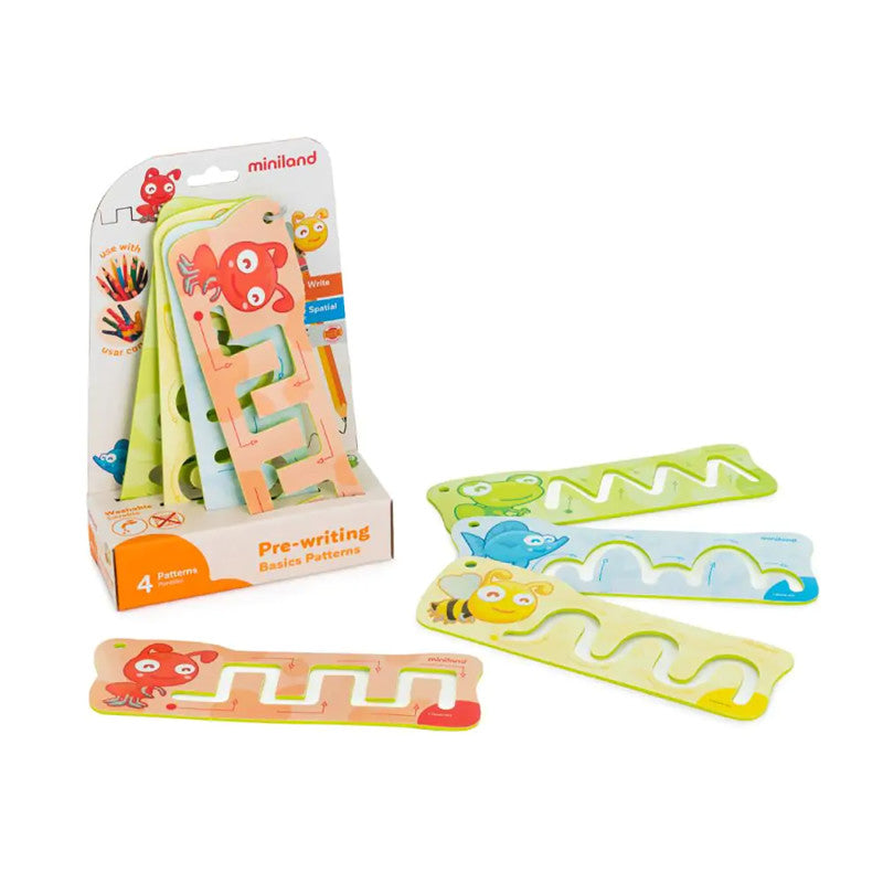 Templates to practice drawing lines in a fun way, helping to pick up habits for pre-writing. The patterns help developing directionality and fine motor skills. They can be used on a range of surfaces with pencils, crayons, chalk, or finger paints. Washable materials. Set of 4.