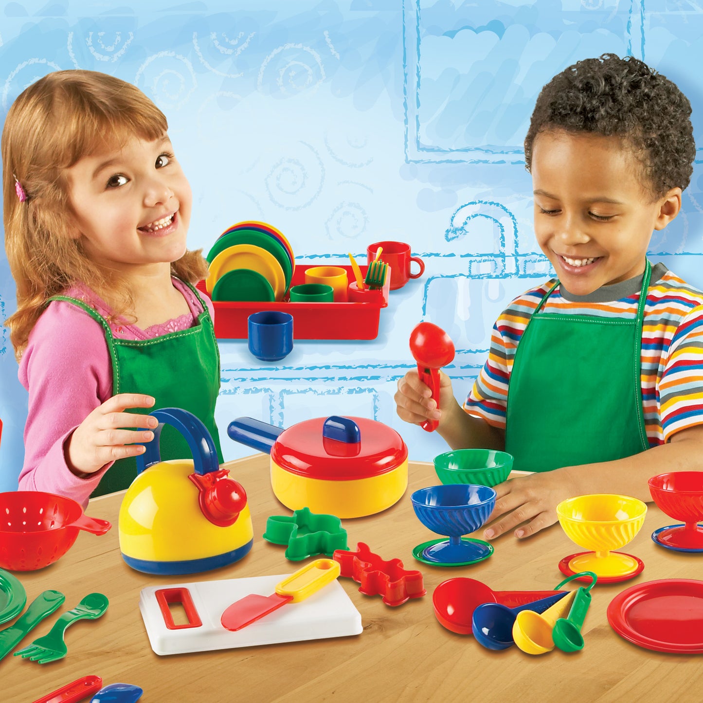 Kids will love to set up their kitchen with this super-sized assortment featuring colorful pots, pans, cups, bowls, dishes, utensils, tea pot, strainer, pitcher, cookie cutters, roller, juicer, dish pan and more. Includes more than 73 durable plastic pieces to provide hours of cooking fun. Comes with large carrying box for easy storage.