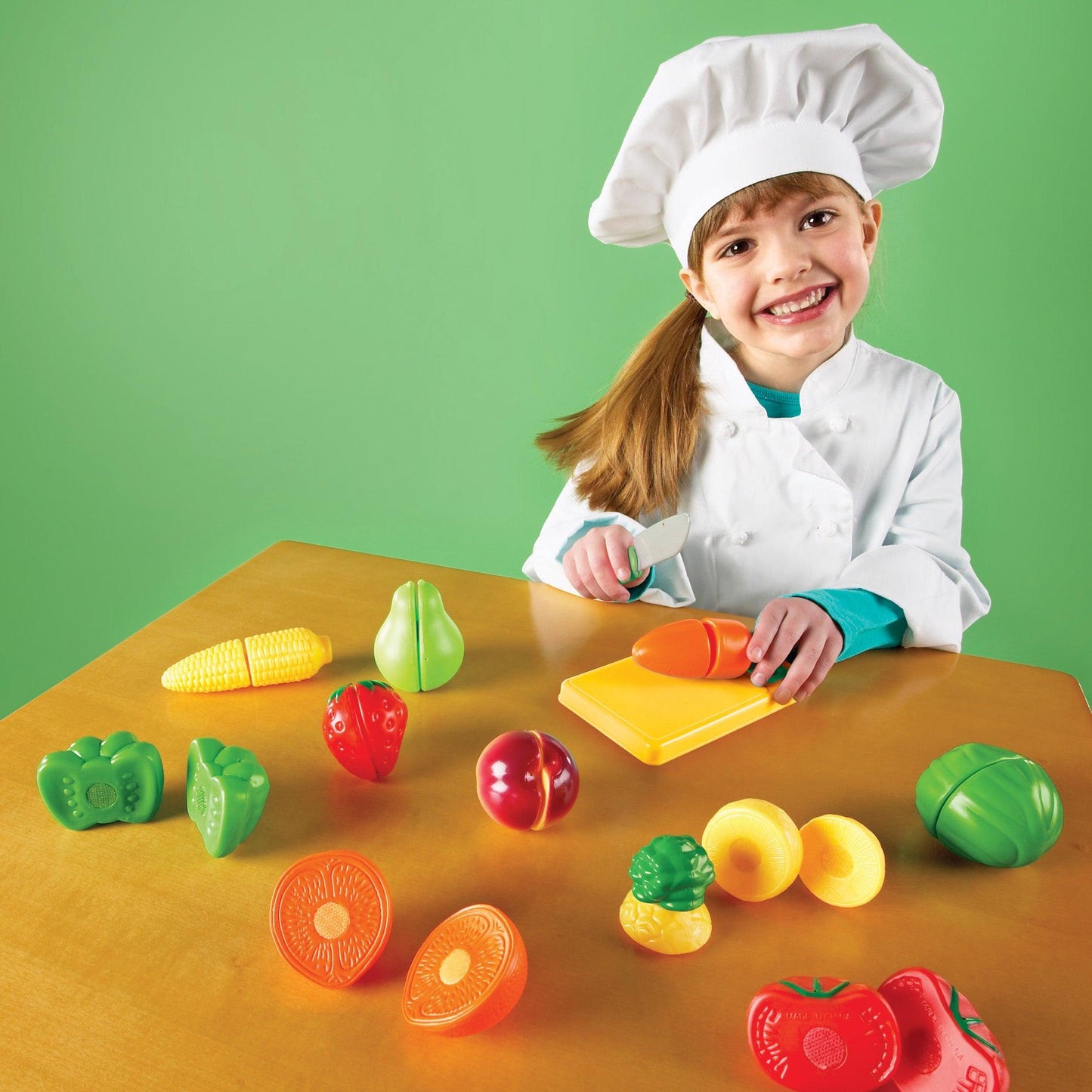 Match food pieces together with hook-and-loop fasteners, then "slice" them apart using the play knife and cutting board. Great for building fine motor skills and language during imaginative play! Includes 1 cutting board, 1 knife, strawberry, orange, plum, pear, pineapple, carrot, corncob, tomato, green pepper, and lettuce. Cutting board measures 6"L x 3.75"W, knife measures 6"L. Grades: PreK+.