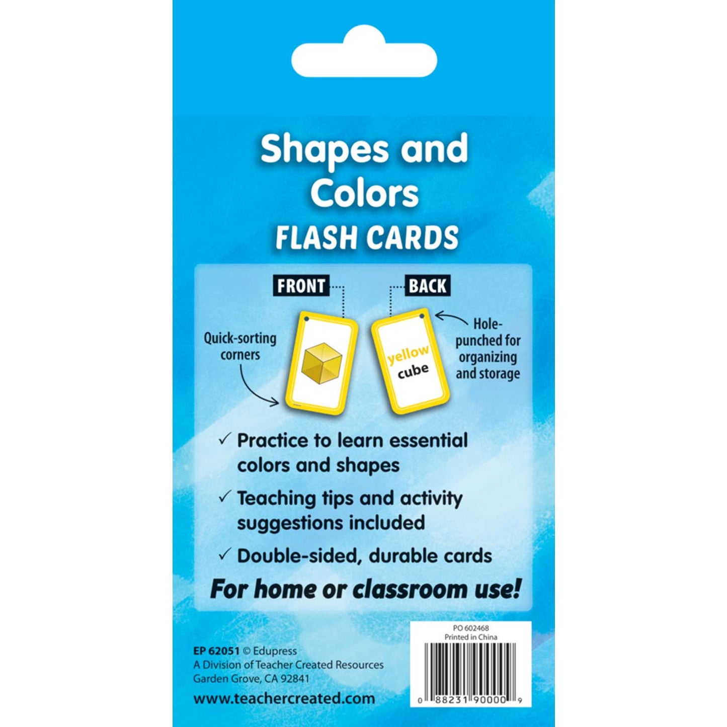 Teach and review shapes and colors individually, in groups, or with the whole class! Each flash card set contains a collection of full-color, high-interest student cards as well as instructions and tips for the teacher or parent, suggested activities, and additional blank cards. Each card has a hole in the top corner that can be fit with a ring or string to help with organization and storage. Additionally, each card has one corner that is shaped differently than the others. By lining up the non-rounded corners, the flash cards can quickly be faced in the same direction. When applicable, flash card sets include answers in small print on the reverse side of each card. Each card measures 3-1/8" x 5-1/8". Each set includes 56 double-sided cards.