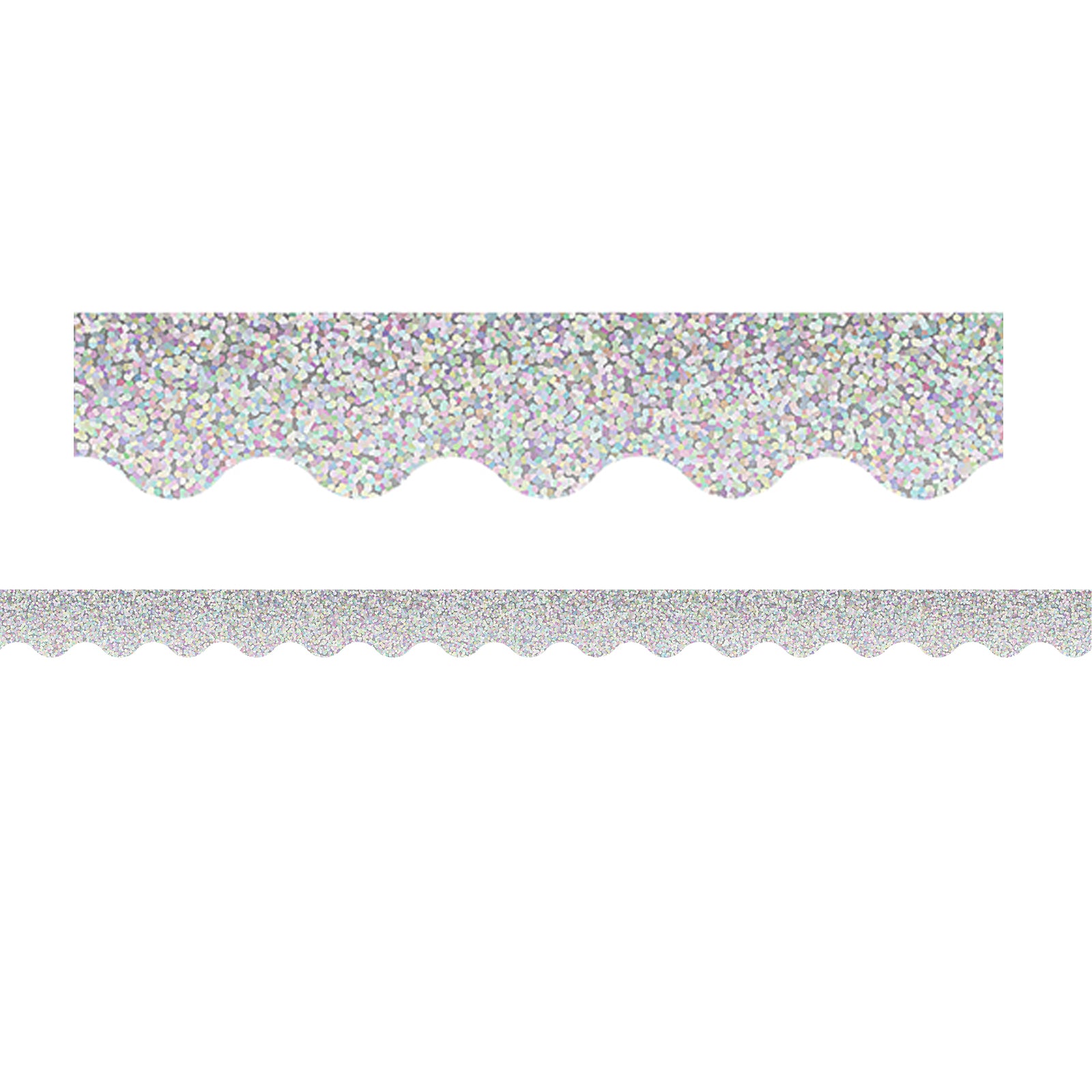 Add a little fun to your classroom with this beautiful Silver Sparkle Scalloped Border Trim. Use to frame student work, bulletin board displays, whiteboards, doors, or any place you want to add a little sparkle.
