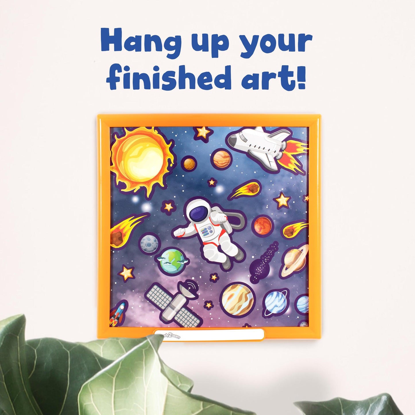 Create 4 different sticker scenes with this complete art kit. Then, frame and display finished work! This sticker art set includes 4 themed background designs, 4 plastic frames with name labels, 4 sheets of stickers and instructions. Children will explore creative expression and imagine new scenes with 200+ stickers and 4 background themes: sea life, space, robots and garden. Children will also improve fine motor skills and as they work to peel stickers and place them on the boards. Sticker art also inspires children to imagine new narratives and try them out on the backgrounds. The stickers securely stick to the backgrounds, which means finished art will last for years. For ages 3+. || Size of background boards: 9.25"W. || Size of square frames: 9.6"W.