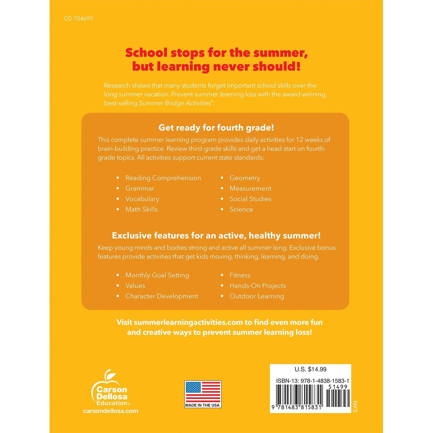 Give your soon-to-be fourth grader a head start on their upcoming school year with Summer Bridge Activities: Bridging Grades 3–4. With daily, 15-minute exercises, kids can review calculating area and using quotation marks and learn new skills like fractions, similes, and metaphors. In just 15 minutes a day, this workbook series helps to prevent summer learning loss while paving the way toward a successful new school year.