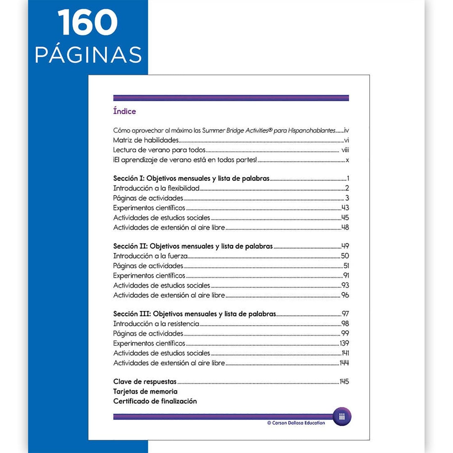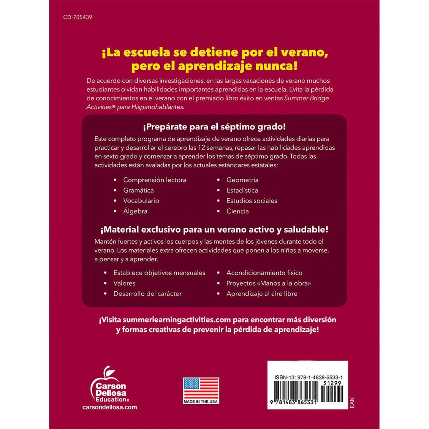 Prevent summer learning loss and prepare your child for back-to-school success in just 15 minutes a day with engaging activities, exercises, fun games, and more – all in one workbook with Summer Bridge Activities Spanish Workbook! This Spanish book helps Spanish-speaking sixth - seventh graders keep their skills sharp while learning English during the summer months to stop summer slide through fun practice pages and activities, covering math, science, reading, writing, social studies, fitness, and more. Students practice with root words, factors, graphing, dictionary skills, social studies, the scientific method, and other engaging topics, with both activities and directions in Spanish. This Spanish workbook for kids includes flash cards and a completion certificate, and features a skill matrix and answer key to track student progress. Each page is numbered by day so kids and parents can track progress and reach monthly learning goals.