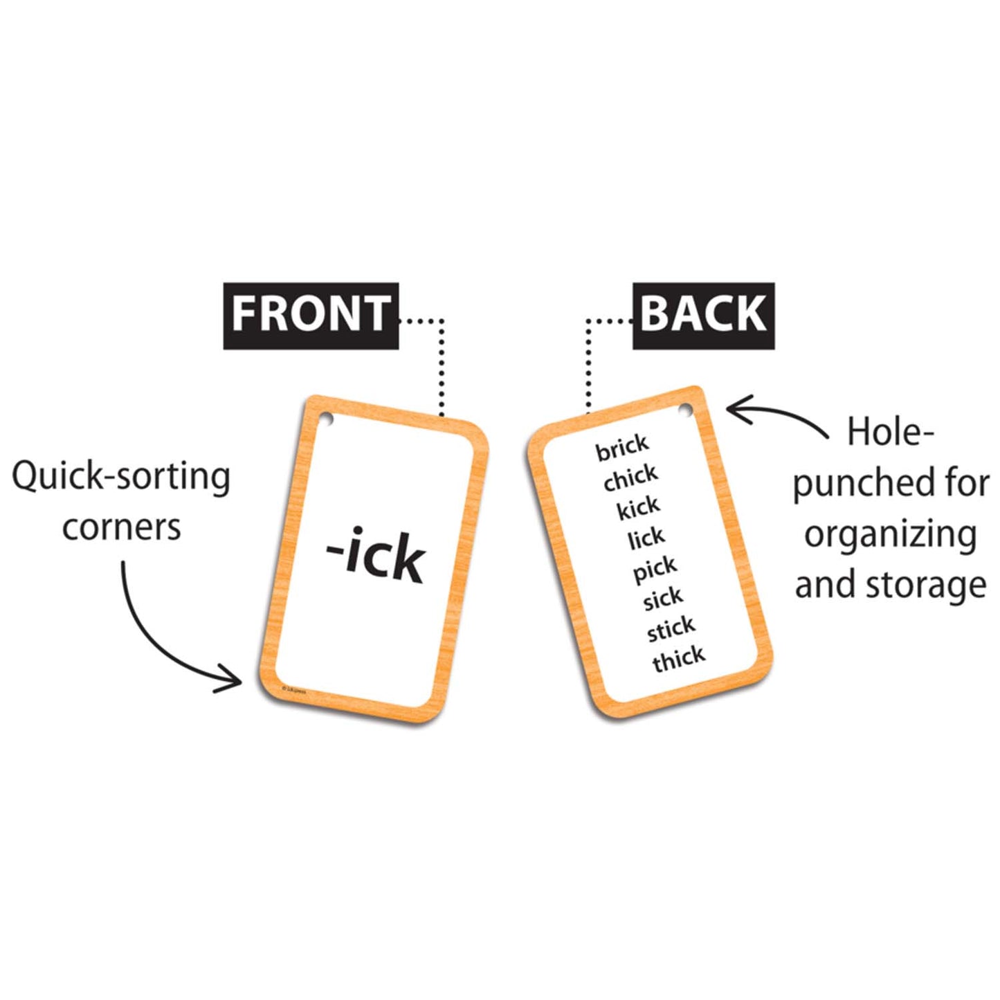 Teach and review word families individually, in groups, or with the whole class! Each flash card set contains a collection of full-color, high-interest student cards as well as instructions and tips for the teacher or parent, suggested activities, and additional blank cards. Each card has a hole in the top corner that can be fit with a ring or string to help with organization and storage. Additionally, each card has one corner that is shaped differently than the others. By lining up the non-rounded corners, the flash cards can quickly be faced in the same direction. When applicable, flash card sets include answers in small print on the reverse side of each card. Each card measures 3-1/8" x 5-1/8". Each set includes 56 double-sided cards.